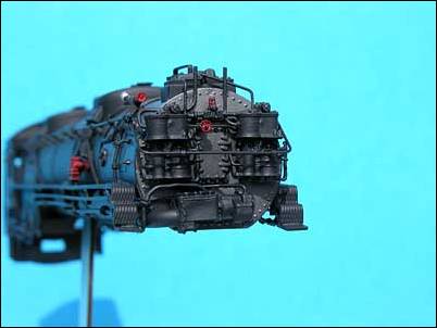 When I finished all the spraying I went back and painted the injectors and valve handles red. The cab area was also sprayed with a light overcoat of glosscoat to prepare for decaling.