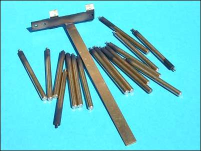 To hold all the parts I made a bunch of painting fixtures from some ¼” brass rod. I cut the rod into roughly 5” sections and then turned down one end to 2mm. I used a die to create a short 2mm x 0.4 threaded portion on the end of each rod. The rods make convenient holding fixtures as they can be screwed into any 2mm threaded holes. To hold the boiler I soldered together a fixture from some brass stock. I drilled and tapped four holes in the fixture and then mounted it to boiler using the same screw holes that hold the boiler bottom in place. Here’s a picture of all the fixtures used for this paint job.